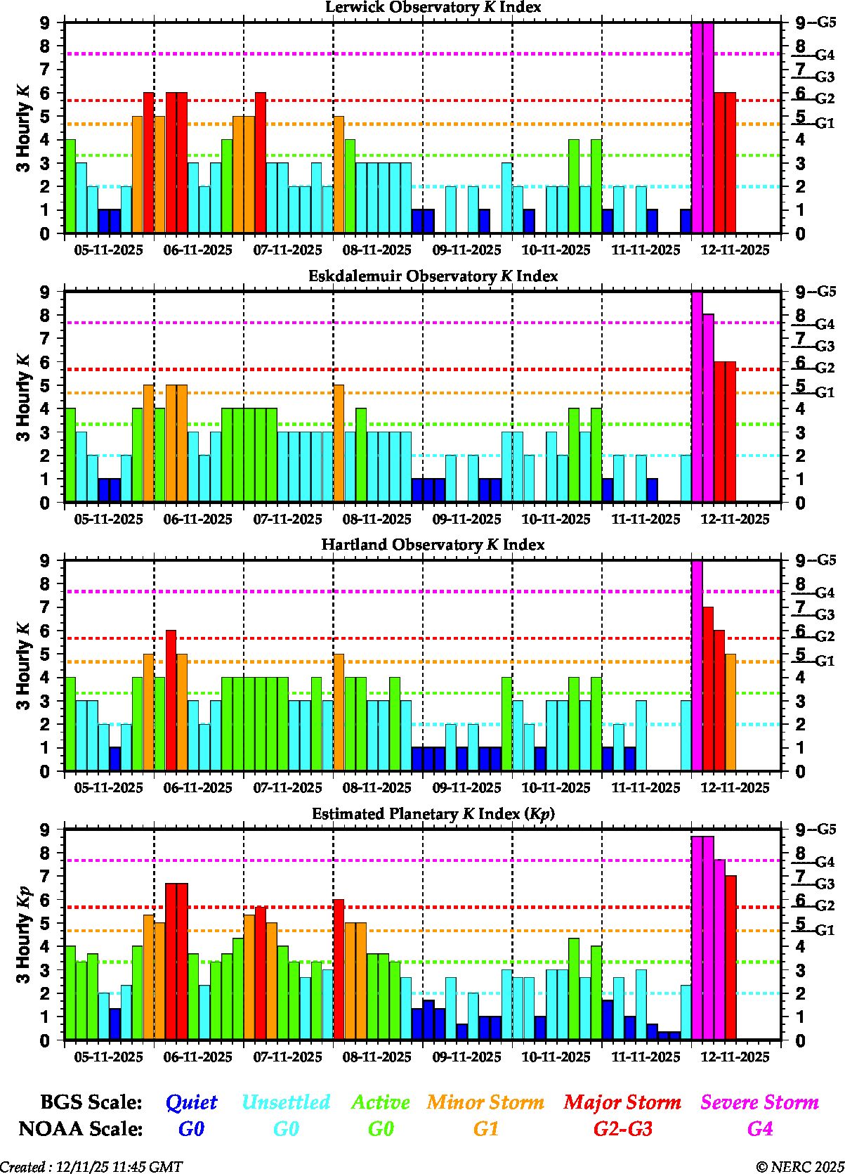 Locally in the UK activity reached G5 (K=9) overnight, and the largest induced geoelectric field to be recorded in the UK since 2012, when BGS records began.